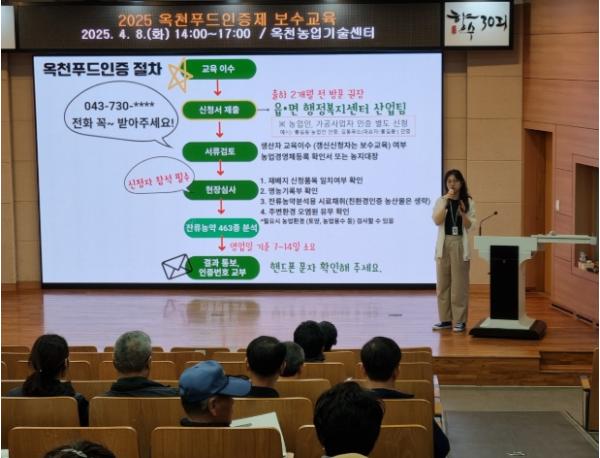 옥천푸드인증을 받으려면 먼저 농촌활력과 로컬푸드팀에서 교육일정을 확인하고 신규 생산자 교육을 이수해야 한다.