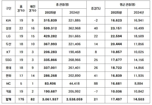 구단 별로는 삼성이 홈 22경기에서 50만 9,312명이 구장을 찾아 전체 구단 중 유일하게 50만 관중을 돌파하며 1위를 기록하고 있다. 다음으로 LG가 42만 9,282명을 기록해 삼성의 뒤를 잇고 있다. 두산 36만 7,993명, 롯데 33만 7,001명, SSG 33만 5,866명, KIA 31만 5,839명으로 절반이 넘는 6개 구단이 30만 관중을 넘어섰다.