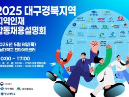[종합뉴스채널, 신철훈기자] 대구광역시는 경상북도와 공동으로 5월 8일 오전 10시부터 영남대학교 천마아트센터에서 대구·경북 지역 대학생과 취업준비생 3,000여 명이 참석한 가운데 ‘2025년 대구·경북 지역인재 합동채용설명회’를 개최한다.