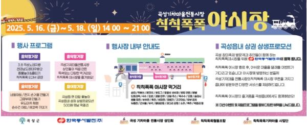 [종합뉴스채널, 신철훈기자] 곡성군이 곡성기차마을전통시장에서 지역 상권 활성화와 전통시장 브랜딩을 위한 야간형 장터, ‘2025 칙칙폭폭야시장’을 오는 5월 16일부터 18일까지 3일간 개최한다고 전했다.