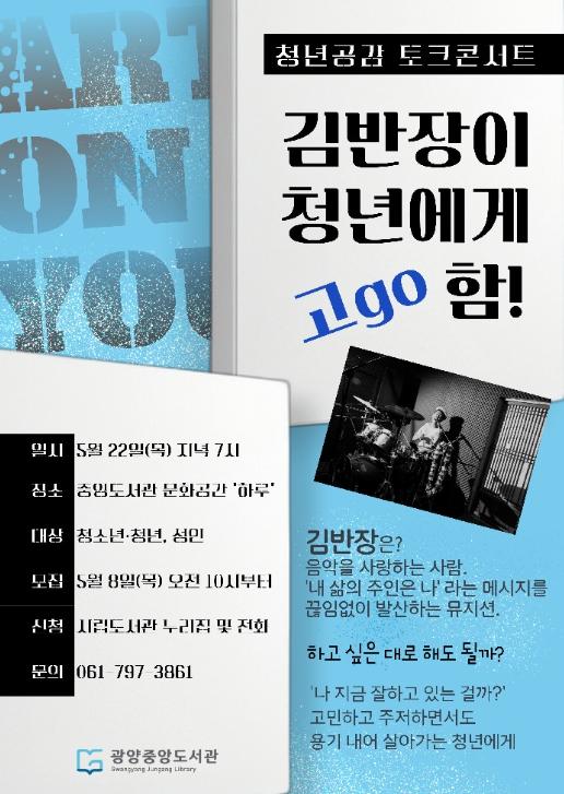 [종합뉴스채널, 김현성기자] 광양중앙도서관은 오는 5월 22일 저녁 7시, 청소년·청년 및 성인을 대상으로 청년 공감 토크콘서트 '김반장이 청년에게 고go 함!'을 개최한다고 8일 밝혔다.