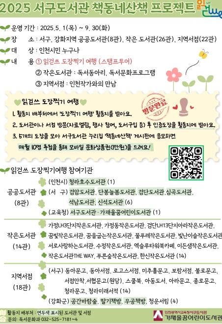 올해로 5년째를 맞는 이번 프로그램에는 서구와 강화군 소재의 공공도서관, 작은도서관, 지역서점 등 총 56개 기관이 참여하며, ‘읽걷쓰 도장찍기 여행(스탬프 투어)’과 다양한 독서 문화 프로그램이 진행된다.