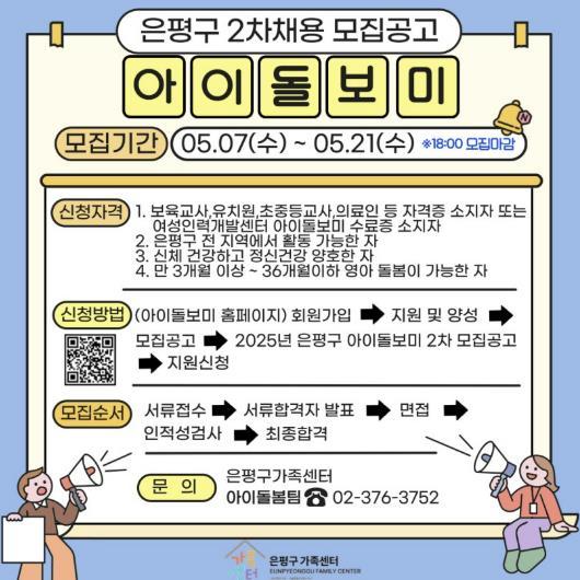 [종합뉴스채널, 박정혜기자] 서울 은평구는 맞벌이 가정과 양육 공백 발생 가정의 양육 부담을 덜기 위해 오는 21일까지 아이돌보미 채용을 한다고 밝혔다.