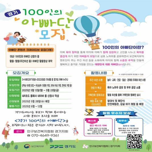 [종합뉴스채널, 최한솔기자] 경기도와 인구보건복지협회 경기도지회는 남성 육아 활성화를 위해 ‘경기 100인의 아빠단’을 모집한다고 13일 밝혔다.