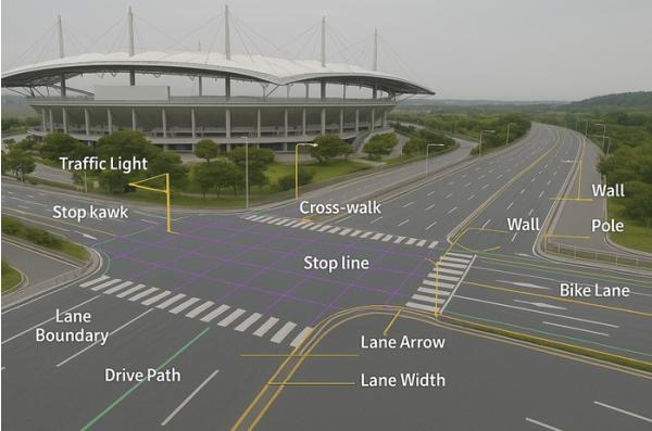 정밀도로지도는 차선·신호등·표지판 등 도로 인프라에 대한 상세 정보를 포함해야 하며, 서울의 복잡한 도시 구조상 실시간 변화 반영을 위한 시스템 마련이 중요하다.