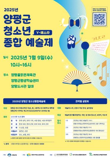 [종합뉴스채널, 김현성기자] 양평군이 주최하고 양평서부청소년문화의집이 주관하는 ‘2025년 양평군 청소년종합예술제 Y-페스타’가 오는 7월 9일 10시부터 16시까지 양평군 일대에서 개최된다.
