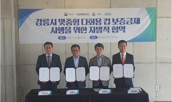 [종합뉴스채널, 홍희주기자] 강원특별자치도는 5월 19일 오전 9시 40분, 강릉시 ‘카페인 에이엠’에서 환경부, 강릉시, 자원순환보증금관리센터와 함께 ‘강릉시 맞춤형 다회용 컵 보증금제 시행 및 재사용 촉진’을 위한 자발적 협약을 체결했다고 밝혔다.