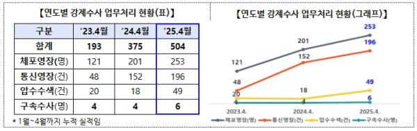 [종합뉴스채널, 홍희주기자] 고용노동부에 따르면 ’25년 4월 기준으로 구속수사, 체포영장 집행 등 강제수사 실적이 504건으로 지난해 같은 시기에 비해 크게 증가(34.4%)한 것으로 확인됐다. 이는 ’23년 4월(193건)과 비교하면 무려 2.6배나 증가한 수치이다.