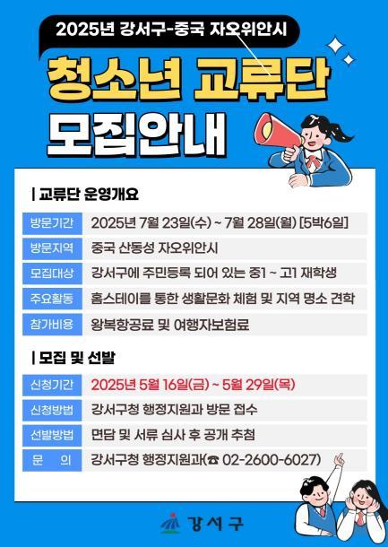 서울시 강서구가 ‘제11기 강서구-자오위안시 청소년 교류단’ 참가자를 모집한다.