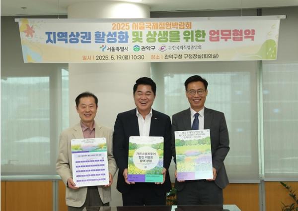 [종합뉴스채널, 박정혜기자] 서울시는 오는 5월 22일부터 서남권 대표 공원인 보라매공원에서 열리는 2025 서울국제정원박람회와 관악구 지역상권 간 상생 협력을 위해, 5월 19일에 관악구 및 (사)한국외식업중앙회 관악구지회와 업무협약을 체결했다고 밝혔다.