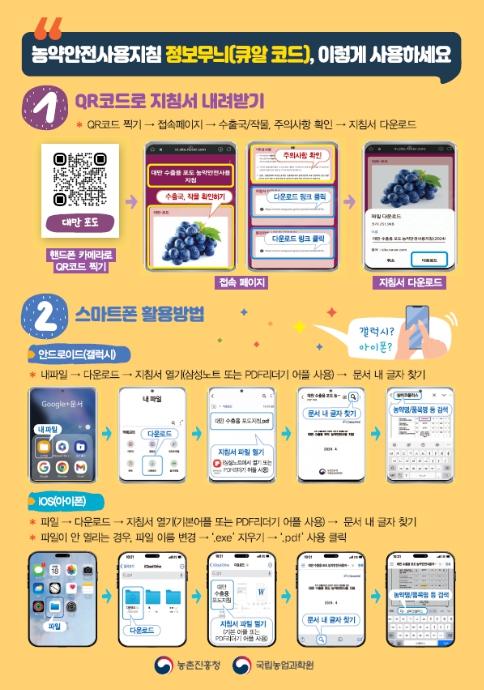 농촌진흥청은 농업인이 수출농산물 생산과정에서 정확한 농약안전사용 정보를 편리하게 확인할 수 있도록 정보무늬(큐알 코드)로 농약안전사용 지침을 제공하기 시작했다고 밝혔다.