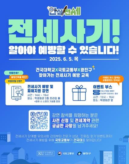 특히, 오는 6월 5일에는 건국대학교 학생회관에서 ‘건국대학교로 찾아가는 부동산 맞춤형 교육’을 개최한다. 국토교통부 전세사기피해지원단과 광진구청, 건국대학교가 함께하는 이번 행사에는 ▲전세 사기 예방 강연 ▲맞춤형 법률·금융·주거 지원 상담 ▲전세 계약 용어 퀴즈 등 참여형 이벤트가 준비되어 있다. 주택 임대차계약 신고제를 포함한 계약 관련 실생활 정보도 안내할 예정이다. 참여를 원하는 학생은 행사 포스터의 QR 코드로 접속해 사전 신청하면 된다.