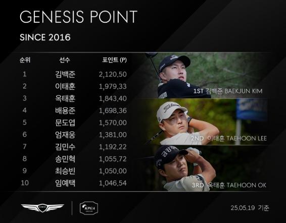 총 2,120.50포인트를 기록한 김백준은 개막전 ‘제20회 DB손해보험 프로미 오픈’ 우승으로 제네시스 포인트 1위에 등극한 이후 ‘2025 우리금융 챔피언십’, ‘제44회 GS칼텍스 매경오픈’, ‘KPGA 클래식’, “SK텔레콤 오픈’까지 5개 대회 연속 제네시스 포인트 1위를 질주하고 있다.