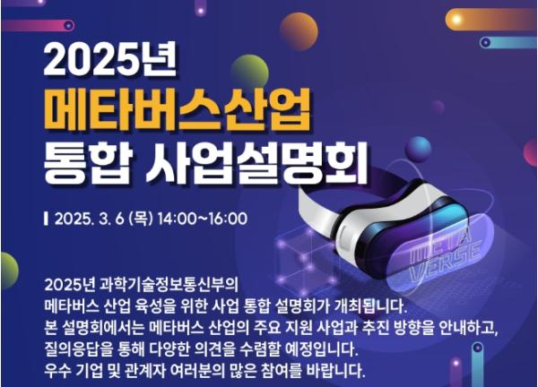 과학기술정보통신부는 인공지능(AI)·확장현실(XR) 등 디지털기술을 융합하여 산업 전반의 혁신을 주도하고 새로운 가치를 창출하는 가상융합산업(메타버스산업) 진흥을 위한 '2025년 가상융합산업(메타버스산업) 통합 사업설명회'를 오는 3월 6일 오후 2시부터 서울 상암동 누리꿈스퀘어(3층 국제회의실)에서 개최한다. 이번 설명회에서는 가상융합산업(메타버스산업) 기업육성 및 세계 진출, 인력양성, 기반 시설(인프라) 분야 등 2025년도 지원사업 소개와 함께'가상융합산업 진흥법'에 따른 제도적 지원에 대해서도 종합적으로 안내할 예정이다.