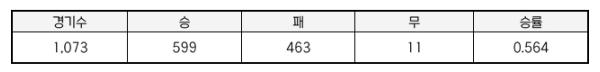 염경엽 감독은 5월 20일(화) 기준, 총 1,073경기에서 599승, 463패, 11무, 승률 0.564을 기록하고 있다.