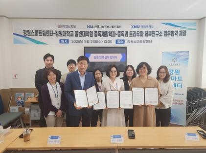 협약식은 강원특별자치도청 내 강원스마트쉼센터에서 개최됐으며, 강원스마트쉼센터 최수진 센터장, 강원대학교 일반대학원 중독재활학과 손원일 교수, 강원대학교 부설 중독과 트라우마연구소 김경옥 교수 등 관계자들이 참석했다.