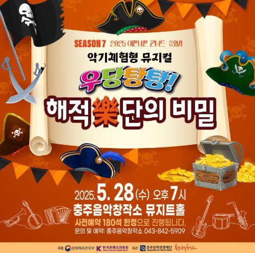[종합뉴스채널, 김현성기자] 충주음악창작소는 오는 5월 28일 오후 7시, 창작소 내 뮤지트 홀에서 2025 음악창작소 프로그램 운영지원 사업의 일환으로 [이판사판 콘서트 시즌 7] 세 번째 공연, 『우당탕탕! 해적樂단의 비밀』을 선보인다.