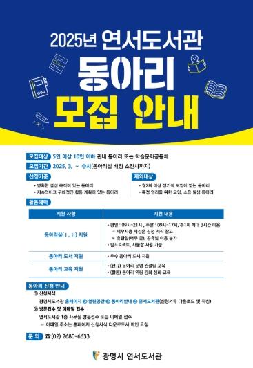 신청은 광명시 도서관 누리집에서 동아리 신청서를 내려받아 작성한 후 이메일 또는 연서도서관(광명시 연서일로 10, 1층)에 방문해 접수하면 된다.