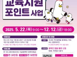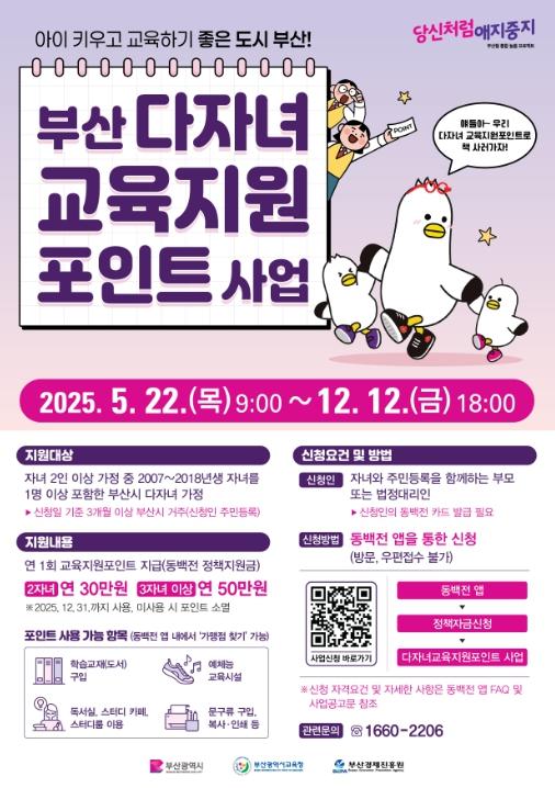 [종합뉴스채널, 박광덕기자] 부산광역시교육청은 다자녀 가정의 교육비 부담을 덜고 저출생 문제 대응을 위해 부산시와 손잡고 ‘2025년 부산 다자녀 교육지원포인트’ 사업을 추진한다.