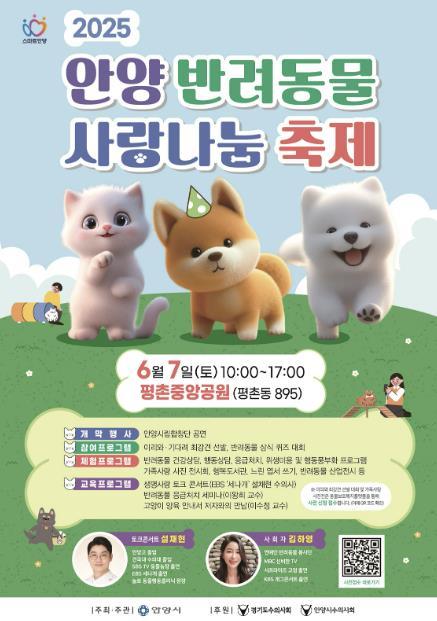 [종합뉴스채널, 김현성기자] 안양시는 반려동물과 시민이 함께 어우러지는 따뜻한 소통의 장 ‘2025 안양 반려동물 사랑나눔 축제’를 오는 6월 7일 오전 10시부터 오후 5시까지 평촌중앙공원에서 개최한다고 22일 밝혔다.