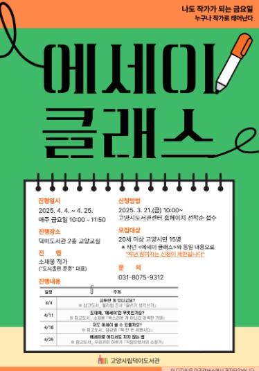 올해 ‘에세이 클래스’는 오는 4월 4일부터 25일까지 매주 금요일 오전 10시, 고양시민 15명을 대상으로 진행된다.