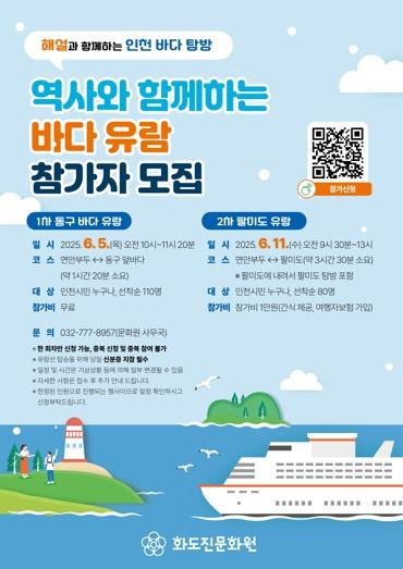 [종합뉴스채널, 김현성기자] 인천 동구 화도진문화원은 인천시민을 대상으로 연안부두를 출발해 동구 앞바다와 팔미도를 둘러보는 해양 유람 프로그램을 6월 운영한다고 밝혔다.