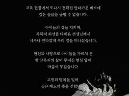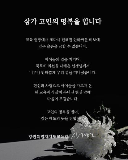 신경호 교육감은 이날 추모 메시지를 통해 “아이들의 곁을 지키며 묵묵히 최선을 다해온 선생님께서 너무나 안타깝게 우리 곁을 떠났다.”라며, “헌신과 사랑으로 아이들을 가르쳐온 한 교육자의 삶이 무너진 현실 앞에 마음이 무겁다.”라고 애도의 뜻을 전했다.