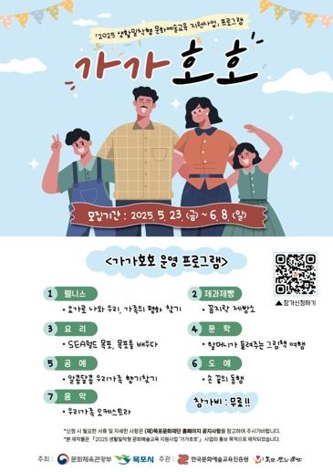 [종합뉴스채널, 김현성기자] 목포문화재단은 문화체육관광부와 한국문화예술교육진흥원이 주관하는 2025년 생활밀착형 문화예술교육 지원 사업 공모에 선정되어, 가족 소통 프로그램 ‘가가호호(家加好好)’를 본격 운영한다.