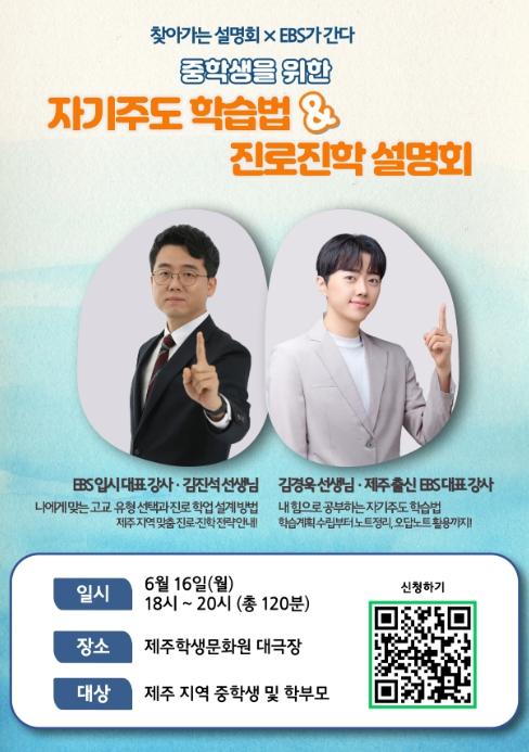 강연은 ▲나에게 맞는 고교 유형 선택과 진로 학업 설계 방법(EBS 진로진학 전문가 김진석 강사) ▲내 힘으로 공부하는 자기주도 학습법(제주 출신 EBS 김경욱 강사)을 주제로 진행된다.