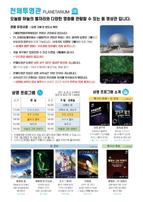한형주 관장은 “국내 최대 크기의 과천과학관 천체투영관에서 멋진 돔영상을 관람하시고, 광학식 투영기로 비춘 별을 보면서 일상에서 벗어나 우주의 신비를 감상하는 시간을 가지길 바란다.”라고 말했다.