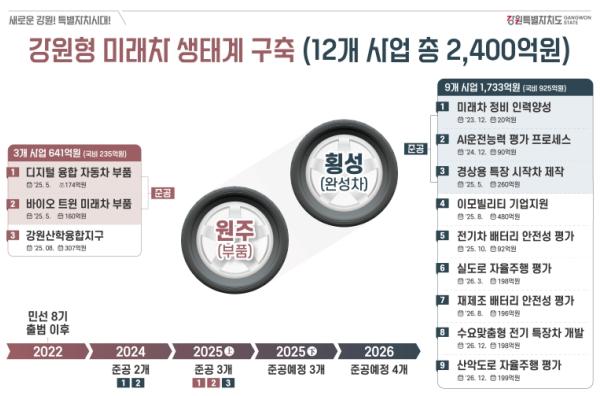 도는 원주와 횡성을 거점으로 총 2,400억 원 규모의 4대 전략 12개 사업을 추진하고 있으며, 이를 통해 자율주행차 실증과 전문인력 양성 기반을 단계적으로 구축하고 있다.