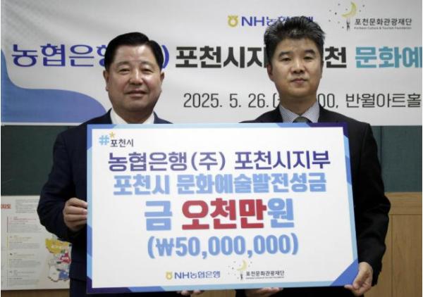 [종합뉴스채널, 최한솔기자] NH농협 포천시지부는 지난 26일 재단법인 포천문화관광재단에 지역 문화예술 발전을 위한 기부금 5천만 원을 전달했다.