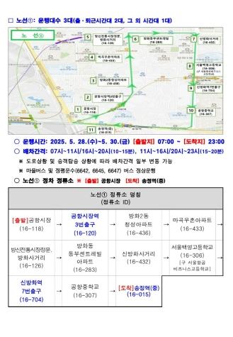 운영 노선은 ▲공항시장에서 출발해 공항시장역(3번 출구), 신방화역(7번 출구)을 거쳐 송정역에 도착하는 1번 노선과 ▲등촌중학교에서 출발해 등촌역(7번 출구), 까치산역(2번 출구), 화곡역(4번 출구)을 거쳐 강서구청에 도착하는 2번 노선이다.