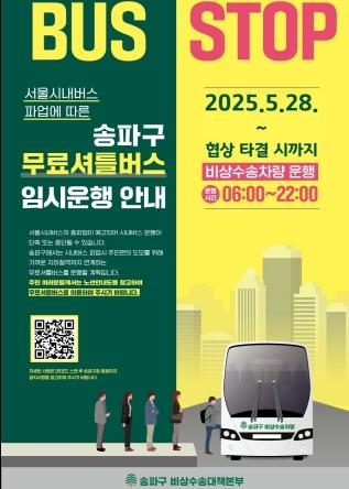 [종합뉴스채널, 박정혜기자] 서울 송파구는 서울시버스노동조합이 28일부터 총파업에 돌입함에 따라 구민들의 교통 불편 최소화를 위해 무료 셔틀버스를 투입하는 등 ‘비상수송대책’을 가동한다고 밝혔다.