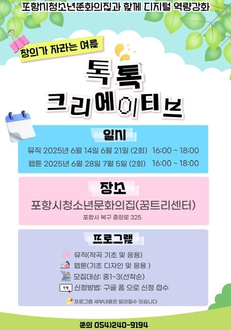 [종합뉴스채널, 김현성기자] 포항시청소년재단 포항시청소년문화의집이 청소년들의 창의력과 디지털 역량 강화를 위한 여름 맞이 특별 프로그램 ‘톡톡크리에이티브’를 6월부터 본격 운영한다.