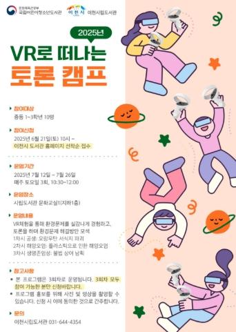 [종합뉴스채널, 김현성기자] 이천시 시립도서관이 국립어린이청소년도서관에서 주최하는 2025년 VR 기반 독서토론 프로그램 사업 운영기관으로 선정되어 중학생을 대상으로 ‘VR로 떠나는 토론 캠프’를 운영한다.