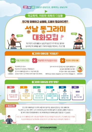 이처럼 동그라미 대화모임은 학교폭력 관련 학생들의 치유와 회복을 위한 디딤돌로써 갈등–관계회복–동반성장의 선순환을 만들어 학교폭력을 새롭게 풀어가는 방법으로 주목받고 있다. 이에 경기도성남교육지원청은 동그라미 대화모임 홍보 포스터를 가정통신문으로 제작하여 관내 학교 학부모들에게 일괄 발송하는 등 도움이 필요한 학생이 손쉽게 참여할 수 있도록 홍보 활동을 지속적으로 실시할 예정이다.
