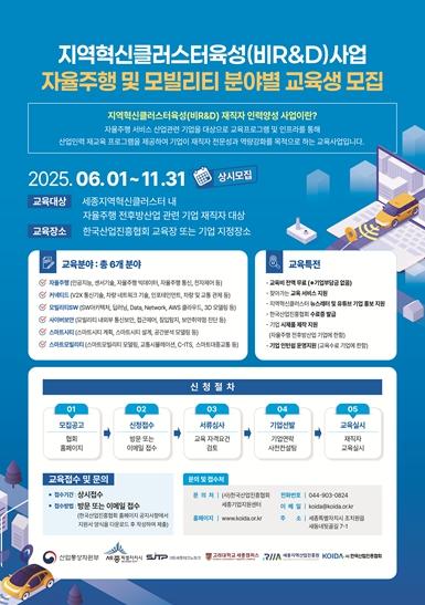 교육은 자율주행, 커넥티드, 모빌리티SW, 사이버보안, 스마트시티, 스마트모빌리티 등 총 6개 분야로 구성되며, 세종시 지역혁신융복합단지 내 자율주행 전·후방 산업 연관 기업 재직자를 대상으로 진행된다.