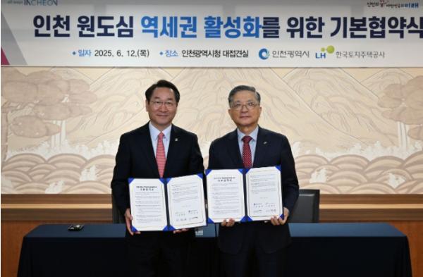 시는 6월 12일 인천시청에서 한국토지주택공사와 ‘인천 원도심 역세권 활성화를 위한 기본협약’을 체결하고, 거점사업 발굴 및 사업시행 전략 검토 등을 공동으로 추진하기로 했다.