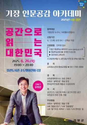 강연은 기장군민 누구나 무료로 참여할 수 있으며, 참여 신청은 12일 오전 9시부터 기장군 평생학습 홈페이지를 통해 선착순 접수로 진행된다.