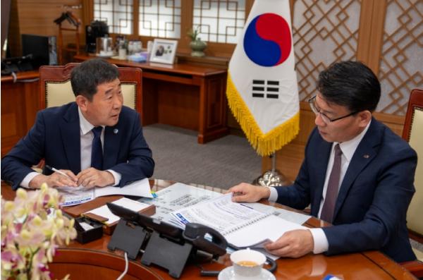 이재영 군수는 12일 한국농어촌공사 김인중 사장을 만나 증평의 주요 농정 현안사업을 공유하고, 원활한 사업 추진을 위한 협조를 요청했다.