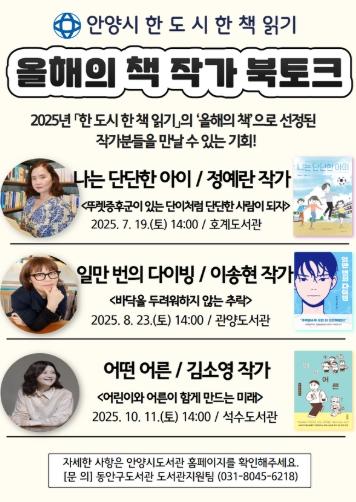 도서관 관계자는 “작가가 직접 전달하는 이야기로 시민과 작가가 함께 생각을 공유하고 공감할 수 있는 자리가 되길 바란다”며, “앞으로도 ‘한 도시 한 책 읽기’ 사업을 통해 도서관과 함께하는 행복한 문화도시 안양을 만들겠다”고 말했다.
