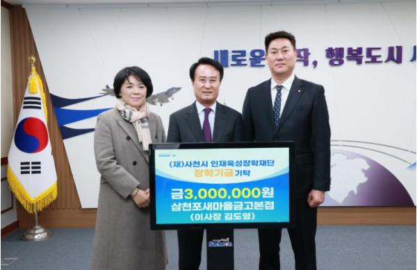 사천시는 삼천포새마을금고 김도영 이사장이 사천시청을 방문해 지역 인재 육성을 위한 장학금 300만 원을 사천시 인재육성장학재단에 기탁했다고 7일 밝혔다.
