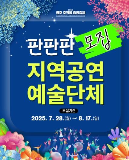 충장축제를 춤판, 놀자판, 노래판으로 만들어 줄 판판판 ‘지역공연예술단체’를 모집한다. 이들은 축제 기간 중 충장우체국, 예술의 거리, 충장로4가, 지하상가 소무대에서 공연을 펼치게 된다. 광주광역시에 소재를 둔 단체 및 개인을 대상으로 60개 단체 내외를 모집한다. 음악·퍼포먼스·마술 등 장르는 무관하며, 공연은 15~40분 이내로 구성되거나 구성할 수 있어야 한다. 참가팀에게는 소정의 공연비를 지급한다.