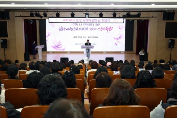충남도는 7일 충남도서관 문화교육동 대강당에서 충청남도 여성단체협의회와 함께 ‘평등한 세상을 향해 더 빠르게 행동하는 힘쎈충남’을 주제로 제117주년 3.8 세계 여성의 날 기념식을 개최했다.