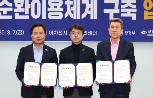 이날 협약은 증가하는 사용후 배터리의 재활용을 통해 친환경 산업 생태계를 조성하고 지속 가능한 미래를 준비하기 위해 마련된 자리로 김완섭 환경부장관, 김학홍 경상북도 행정부지사, 이강덕 포항시장이 참석했다.