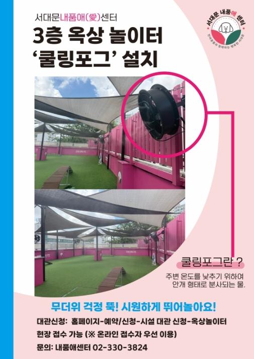 [종합뉴스채널, 박정혜기자] 서울시 서대문구는 반려동물 종합 문화공간인 ‘서대문 내품애(愛)센터’(모래내로 333) 옥상놀이터에 최근 쿨링포그(안개분사 냉방장치)를 설치하고 본격 운영에 들어갔다고 25일 밝혔다.