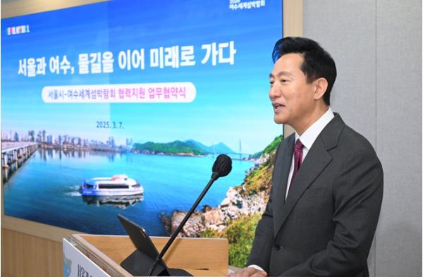 협약식에는 오세훈 서울시장과 박람회 공동조직위원장인 김영록 전남도지사, 정기명 여수시장, 박수관 ㈜YC Tec회장이 참석한다. 협약 이후 서울시는 박람회 사전 홍보와 공동마케팅을 적극적으로 지원하고 박람회를 계기로 섬관광 활성화 방안도 지속적으로 마련해 나간다.