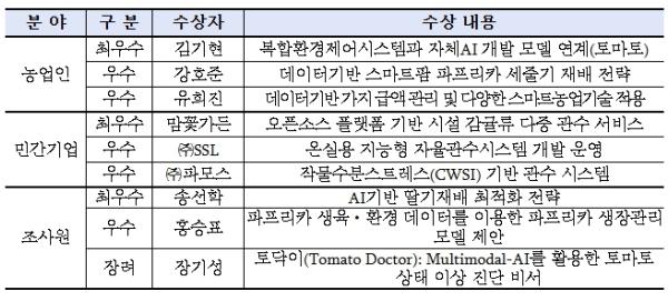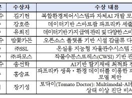이번 경진대회는 인공지능(AI)과 빅데이터를 활용한 스마트농업의 현장 적용 우수사례를 발굴하고 확산하자는 취지에서 △스마트 영농 농업인 △민간기업 △농업빅데이터조사원 세 분야로 나누어 진행했다.