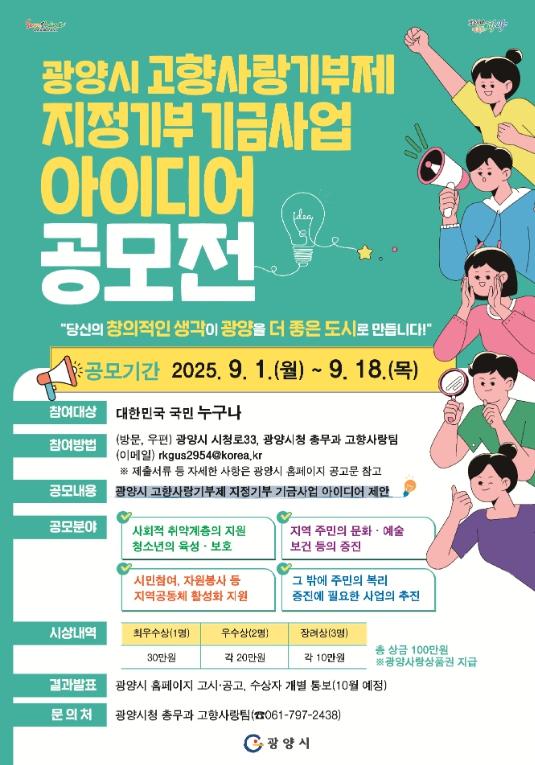 응모는 방문, 우편, 이메일을 통해 가능하며, 세부 사항은 광양시청 누리집(홈페이지) 고시·공고란에서 확인할 수 있다.